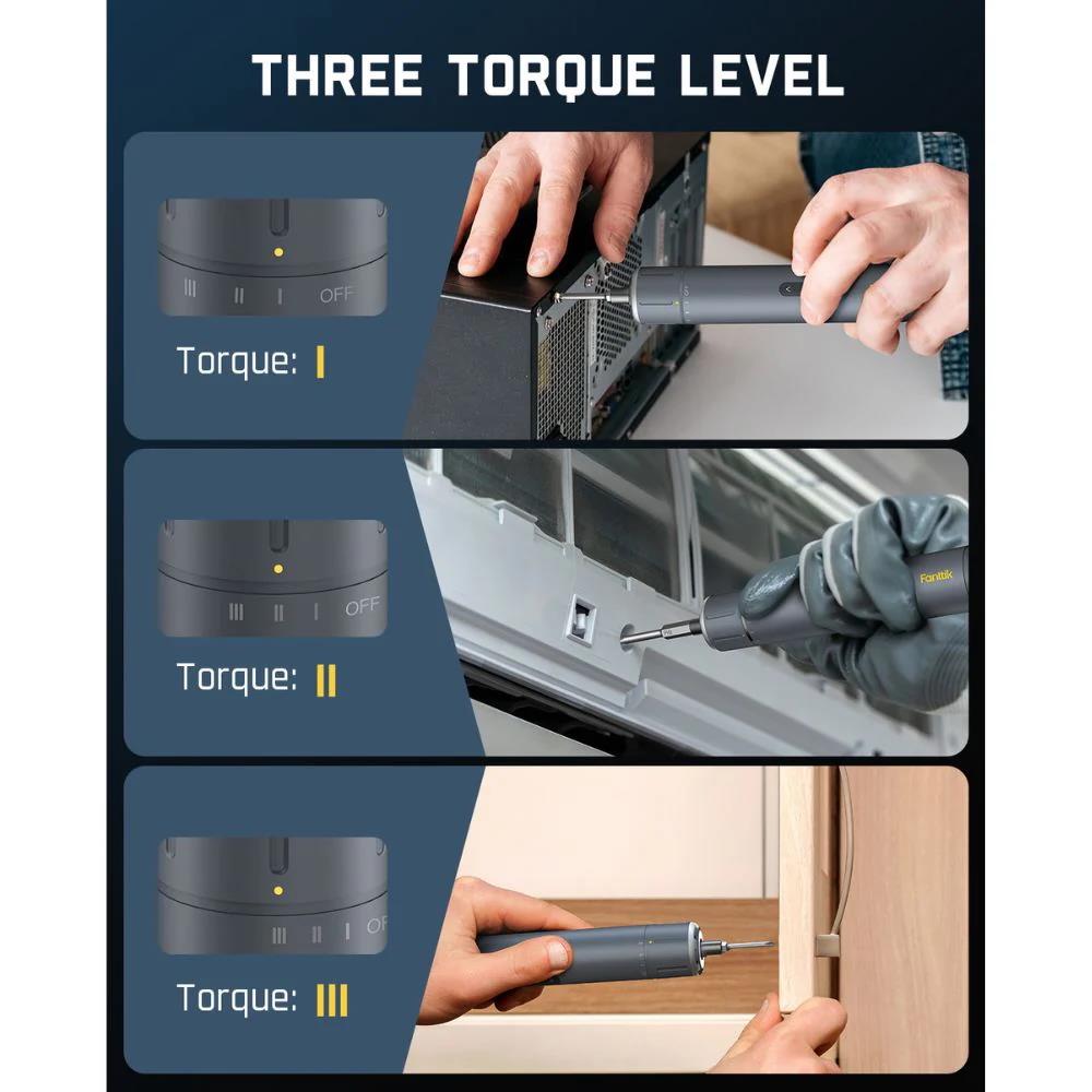 Con 50 punte di 9 categorie, il mini cacciavite elettrico Fanttik può prepararti per una varietà di Dotato di 3 livelli di coppia di 1,5/3/4,2 Nm e coppia massima di 6 Nm, nonché una coppia manuale di 8 Nm. Arresto immediato nel momento in cui il dito si solleva, lavora in modo intelligente e non duro. Questo potente cacciavite elettrico offre forze di coppia precise per le tue esigenze di lavoro pratico. Ideale per il montaggio e la riparazione di mobili, condizionatori d'aria, rubinetti, prese elettriche, computer desktop, ecc.