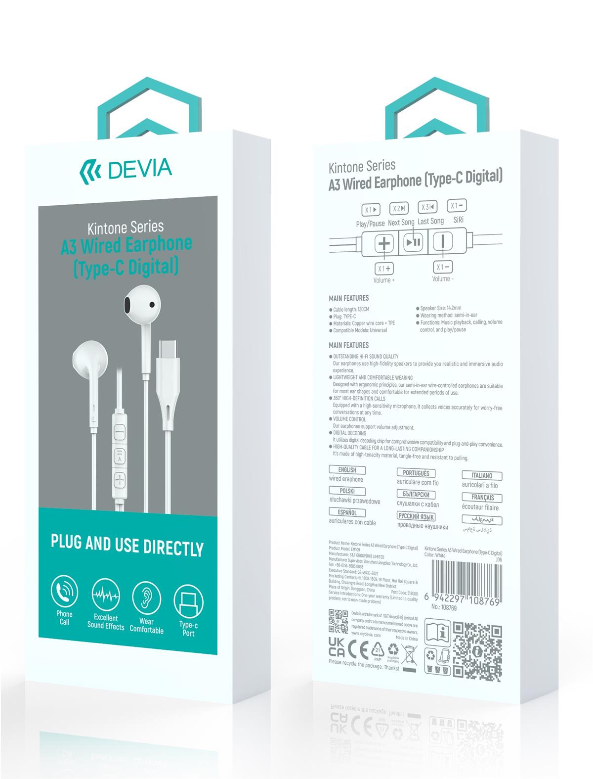 Auricolari A3 Digital filo con connettore Tipo-C compatibile Android e Apple Bianco