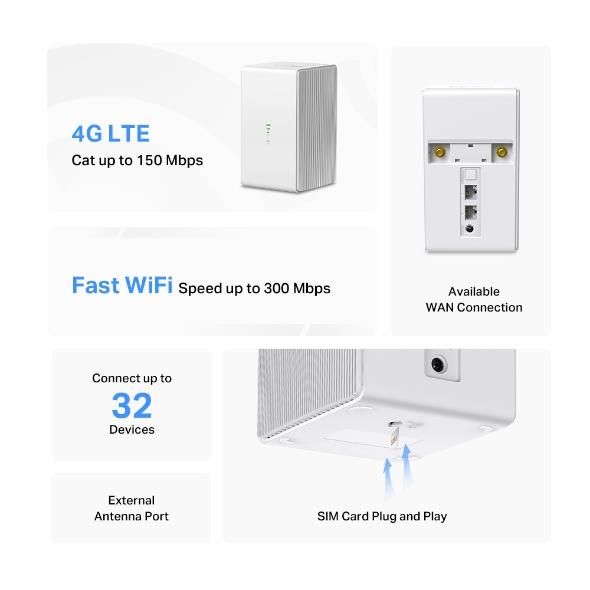 MB110-4G è un Router Wi-Fi che utilizza tecnologia mobile 4G LTE per connettere la tua casa con velocità fino a 150 Mbps in download e 50 Mbps in upload. Il dispositivo crea una rete Wi-Fi 2.4GHz con velocità fino a 300Mbps per connettere in modo stabile un massimo di 32 dispositivi wireless in contemporanea.