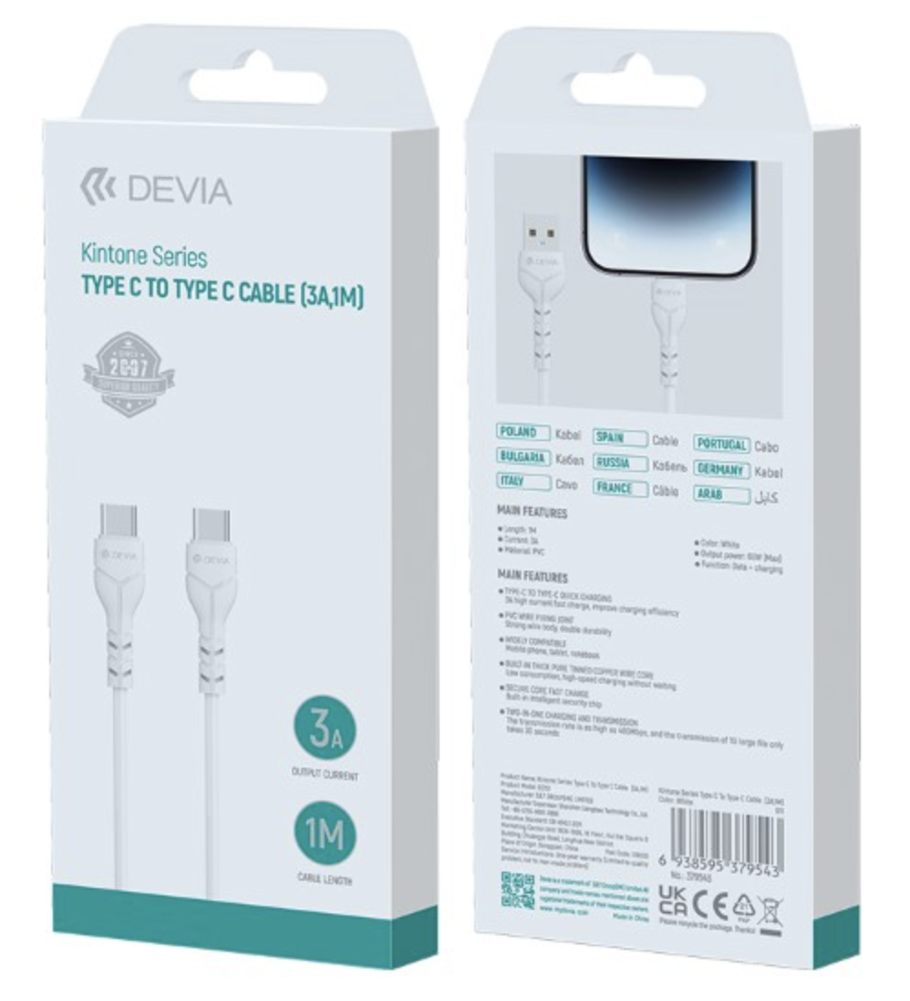 Kintone Cavo da Tipo-C a Tipo-C 5V 3A 1Mt Carica e dati Bianco.