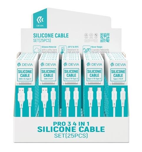 Il set di cavi DEVIA PRO3 4-in-1 in silicone è la soluzione ideale per punti vendita, rivenditori e installatori che desiderano offrire cavi di ricarica di alta qualità, resistenti e dal design moderno.