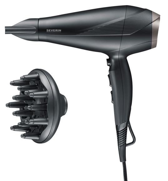 Asciugacapelli Potenza: 2.300 W, 2 velocità e colpo ad aria fredda, motore CA, pulsante di accensione, con un semplice clic, il cavo scompare nell'impugnatura, senza che si aggrovigli. Beccuccio concentratore staccabile, diffusore per un volume perfetto. Griglia di ingresso dell'aria rimovibile per una facile pulizia.
