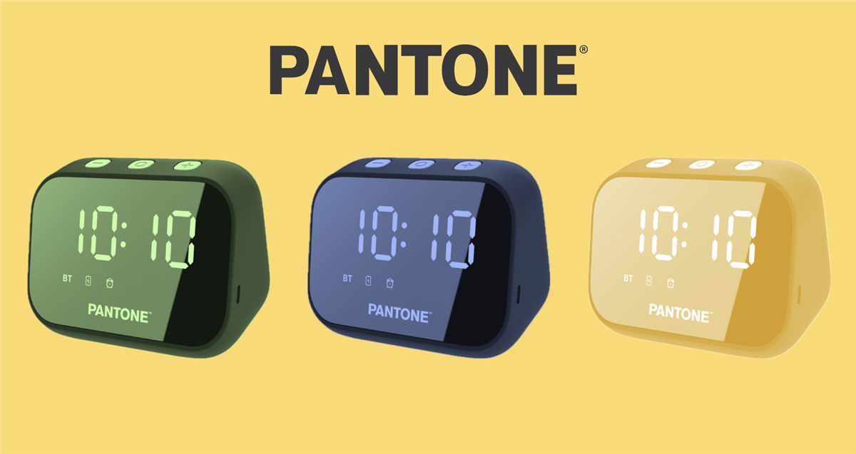 PANTONE SVEGLIA DIGITALE CON FUNZIONE SPEAKER • Connessione wireless al dispositivo • Tasti multifunzione • Display LED • Output speaker: 5W • Porta USB-C (cavo incluso nel pack) • Raggio operativo: 10m • Base in silicone per un Maggiore grip