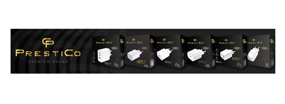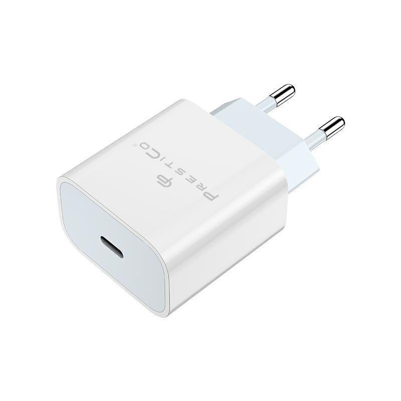 PRESTICO F8A - Caricabatterie da rete 20W - USB-C - Ricarica veloce - Circuito di protezione contro sovraccarico - Colore bianco - Imballaggio in cartone - Input: 100-240V, 50/60Hz - Output: 5V-3A/9V-2,22A/12V-1,67A - MASTER CARTON 50 pz.